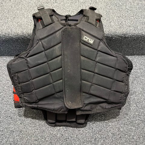 CRW säkerhetsväst i svart färg. Västen har vadderade paneler fram och bak för stötdämpning och skydd vid ridning eller annan aktivitet där extra skydd önskas. Justerbara axel- och sidopartier ger möjlighet till anpassad passform. Yttermaterial i textil med kardborreknäppning framtill.