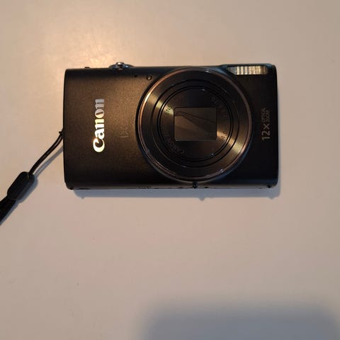 I annonsen ingår kamera, laddare med nätkabel samt manual/dokumentation enligt bilderna. Kameran lämpar sig för allmän fotografering, resor och vardagsbilder där en smidig kompaktkamera önskas.