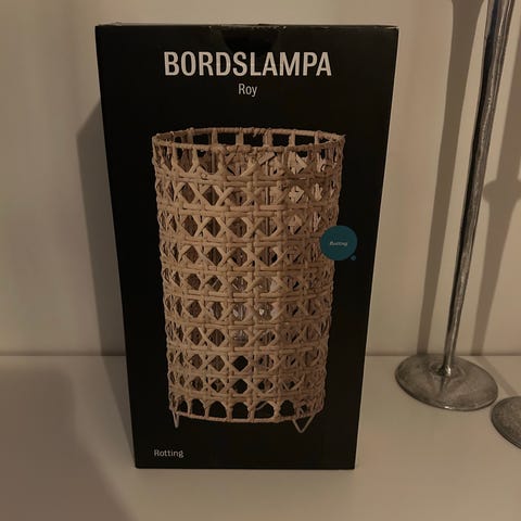 H&M Home bordslampa i trä och mässingsfärgad metall med lampskärm i flätad rotting i naturfärg. Passar som belysning på sidobord, skrivbord eller sängbord i vardagsrum eller sovrum. Fint skick!
