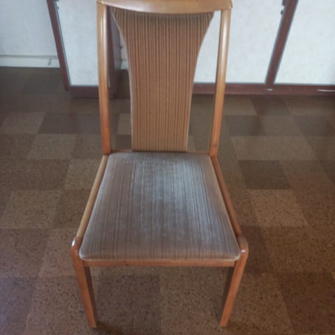 Stolar till matbord med finsnickeri. Stolarna har dekorativt snidade ryggstöd och böjda ben. Sitsarna är klädda i tyg med geometriskt mönster. En av sitsarna har en större reva i tyget och vissa kanter visar slitage (se bilder). Använts som matstolar.