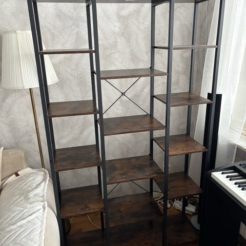 Världens finaste floating hylla ❤️ Specialbeställd på snickeri i träslag jag ej minns. Floating effekt med bredare/djupare ben än hyllplan. Elen gömd baktill, men behöver kopplas in i uttag. Ca 155cm hög, 94cm bred, hyllplanen 19-19,5cm djupa, benen 27,5cm djupa.