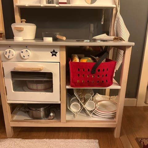 Spisen har tre kokplattor upptill och ugn med lucka framtill. Reglage och vred på framsidan för enkel lek. Avsedd för barn som del av leksakskök eller kökslek inomhus.