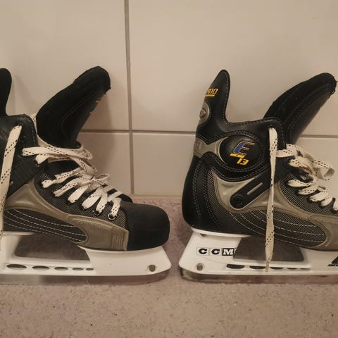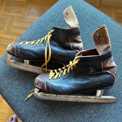 Vintage MCB Express skridskor i storlek 46. Modellen har röd och svart ovandel med snörning och fast monterad skena. Klassiska ishockey-/allmänna skridskor i skinn/läder med traditionella skenor.