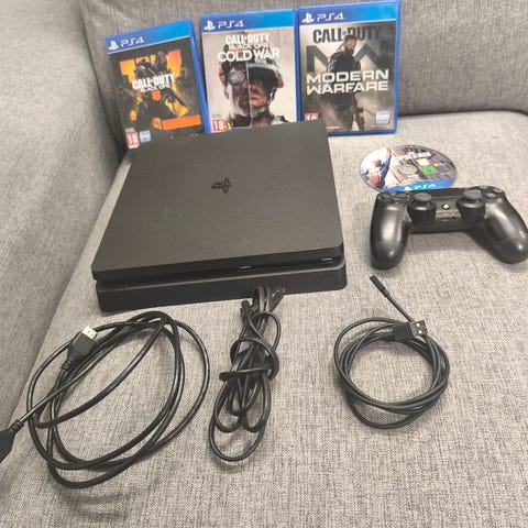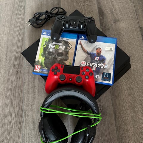 Sony Playstation 4 spelkonsol med fyra trådlösa DualShock 4-handkontroller i färgerna svart och guld. I annonsen ingår även tre PS4-spel i FIFA-serien enligt bilderna. Passar för spel, film och annan underhållning via Playstation 4-systemet.
