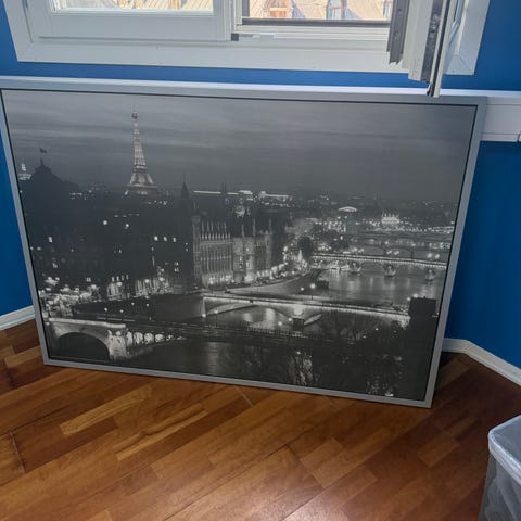 Svartvit panoramatavla med motiv av en storstadssilhuett vid vatten. Rektangulärt format som passar exempelvis över soffa eller säng. Tryckt bild monterad på styv skiva eller duk, avsedd för väggupphängning i inomhusmiljö.