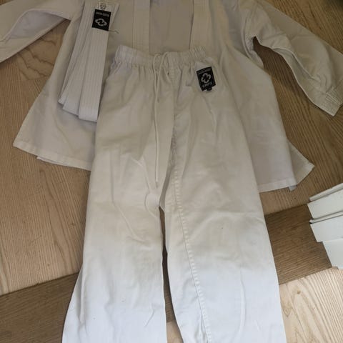 Budo-Nord karategi för barn, storlek 140. Dräkten är vit och består av jacka och byxa med resår och dragsko i midjan samt vitt bälte. Materialblandning i bomull och polyester enligt etikett. Passar till karate och annan kampsportsträning för barn runt längd 140 cm.