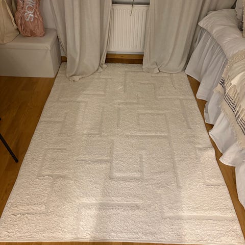 Jotex matta långluggad i vit färg. Mattan har mjuk, tät lugg som ger en ombonad känsla och passar i exempelvis vardagsrum eller sovrum. Undersidan är vävd för stabilitet. Materialblandning enligt etikett med syntetfibrer och andra textilfibrer. Avsedd för inomhusbruk.