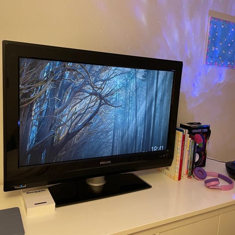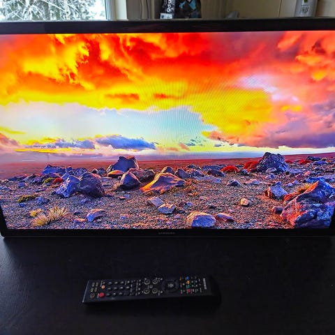 Sharp Aquos tv i svart utförande. Platt skärm med bordsstativ och medföljande fjärrkontroll. På baksidan finns flera anslutningar, bland annat HDMI och antennkontakt. Passar för tv-tittande och anslutning av externa enheter som spelkonsol och mediaspelare.