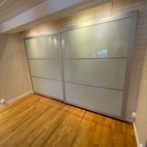 Två skjutdörrar från ikea (Skytta, med ”mehamn” paneler som går att ha både som vita och ek) med tillhörande skena / spår.