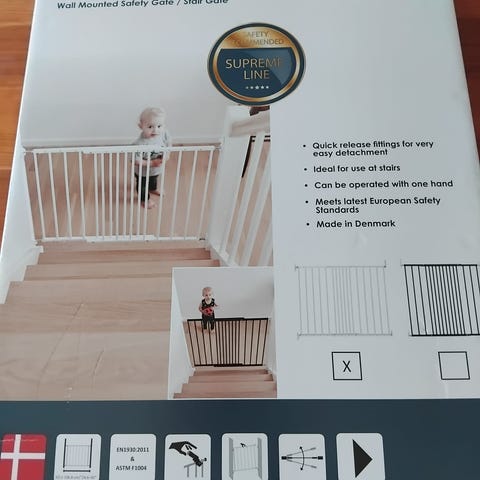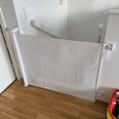 Barnsäkerhetsgrind i utdragbar modell med nätpanel. Passar öppningar upp till cirka 140 cm. Levereras med väggfästen, skruvar och monteringsdetaljer för fast installation. Nätet är i grå färg och rullas in i kassett när grinden öppnas. Avsedd för att avgränsa utrymmen inomhus, exempelvis mellan rum eller vid trappor, för barn eller husdjur. Helt ny i kartong.