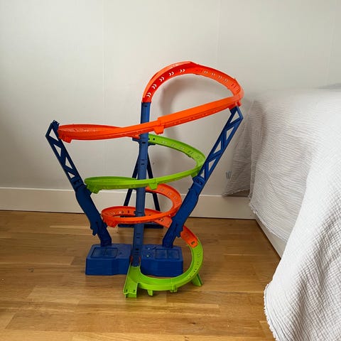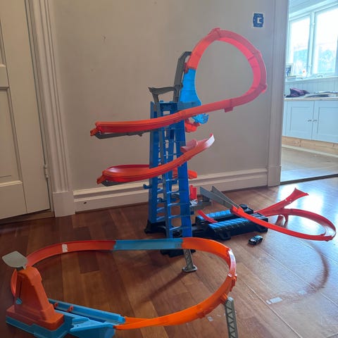 Hot Wheels bilbana med loop och katapultstart. Banan består av en orange loopsektion och grå/blå start- och landningsdel i plast. Avsedd för små leksaksbilar från Hot Wheels eller liknande storlek. Passar som fristående bana eller kan kombineras med andra Hot Wheels-delar om man har det hemma. Används inomhus på golv eller annan plan yta.