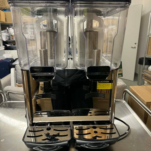 Elektrisk dryckeskylar i rostfritt stål med digital temperaturdisplay på framsidan. Utrustad med kontrollpanel för temperaturinställning och av/på-knapp. Övre delen har ett runt glaslock med svart kant. Passar för kylning av drycker eller andra livsmedel där justerbar temperatur är önskvärd, exempelvis vid servering eller förvaring i hemmet eller på mindre evenemang.