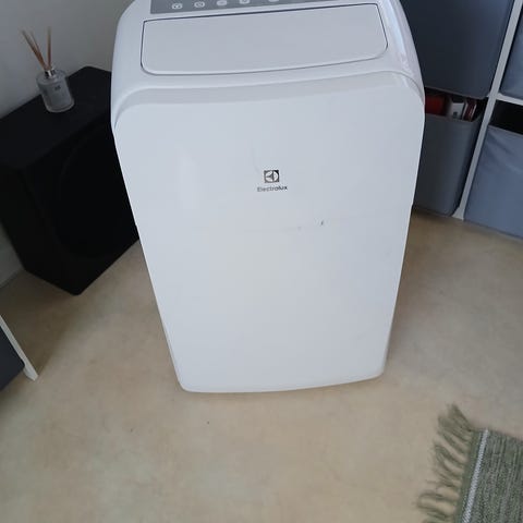Portabel luftkonditionering i vit färg. Enheten är fristående och är avsedd för inomhusbruk. Den har kontrollpanel på ovansidan samt medföljande fjärrkontroll. På baksidan finns luftutsläpp med anslutning för slang (som också finns och är oanvänd). Praktiska bärhandtag på sidorna underlättar förflyttning mellan rum. Levereras med manual för användning och inställningar.