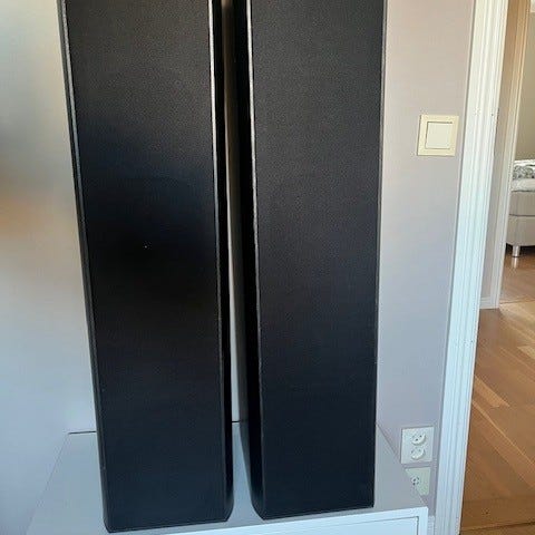 Paret MIRAGE OM-12 såkallat omnidirectional speaker. Höjd ca 1 meter, bredd ca 23 cm, djup ca 27 cm. Rejält tunga. Effekttålighet uppemot 200 watt. Låter bra.