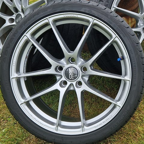 Mkt fint skick, med tysta,fina däck ca 6mm kvar sitter 225/40-18 på. Ställbar hålbild 5/112 nu, 8×18 et 38, medföljer imaz navkapsel ,navringar.