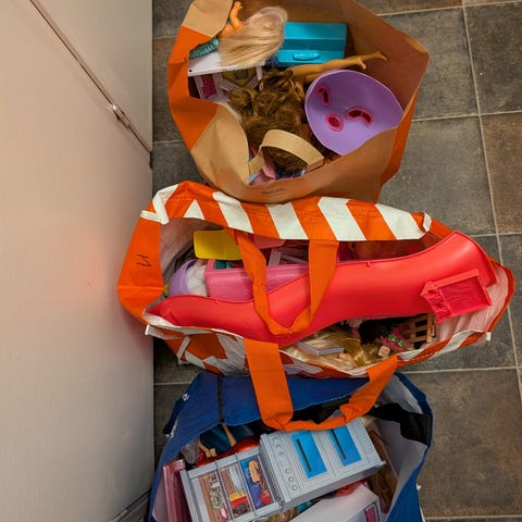 Barbie leksakspaket med blandade leksaker och tillbehör. Paketet innehåller bland annat Barbie-relaterade saker samt olika spel och pussel för barn.