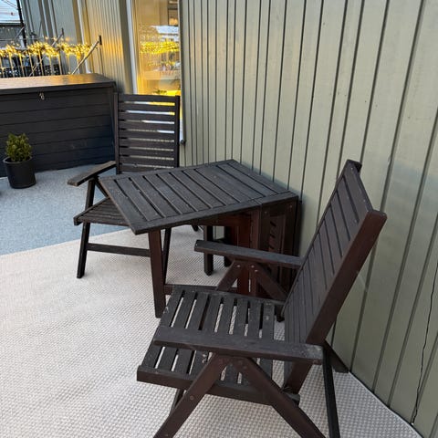 Loungestol för utomhusbruk i svart trä. Stolen har lutande ryggstöd med ribbor och låg sitthöjd, anpassad för avkoppling i trädgård, på altan eller uteplats. Konstruktionen är i trä med breda ben för stabilitet på olika underlag.