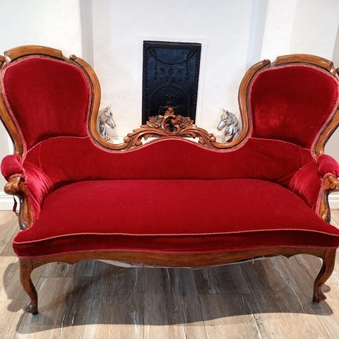 Kanapé i nyrokoko. Schäslong i röd sammetsklädsel med mönstrad struktur. Träram med profilerad kant och ben i trä. Möbeln är utformad med hög rygg på ena sidan och lägre avslut på den andra, lämplig som liggmöbel i vardagsrum, sovrum eller hall. Passar som sitt- och viloplats samt som inredningsdetalj i klassisk stil. Från sekelskiftet, omklädd.
