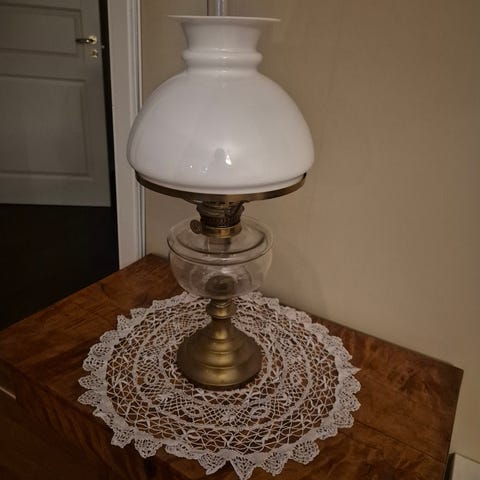 Fantastiskt fin fotogenlampa den är i ett fin skick och alla delar är hela. Den har en stor behållare för fotogen. Jättefint ljus när den är tänd. Höjd 52cm