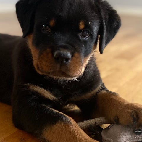 Med tungt hjärta söker vi nu ett nytt, långsiktigt och mycket engagerat hem till vår älskade rottweilerhane Aslan, ca 1 år och 4 månader, renrasig med stamtavla, okastrerad.