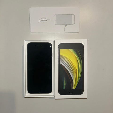 Apple iPhone SE (2-3 gen) smartphone med 64 GB intern lagring. Modellen har kompakt design med hemknapp och fingeravtrycksläsare på framsidan. Baksidan är i glas med Apple-logotyp och en enkel kamera. Enheten lämpar sig för vardaglig användning som samtal, meddelanden, surf, appar och fotografering. Levereras med originalkartong och laddsladd (ej adapter). Batterikapaciteten är 92%.