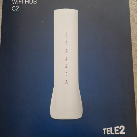 WiFi Hub C2 router i vit färg. Trådlös router för hemmanätverk, Enheten är utformad för att ge wifi-täckning i bostaden och har indikatorlampor på framsidan för status och anslutning. Lämplig som central enhet för att ansluta flera enheter till internet via trådlöst nätverk.