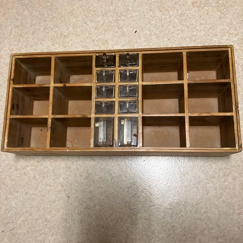 Specerihylla i trä med skäppor av glas. En av de stora har en spricka i sig men det påverkar inte funktionen. Efter lite målning kommer den se finfin ut! Har använt till både kryddor och pysselgrejer. Hämtas på Kungsholmen.