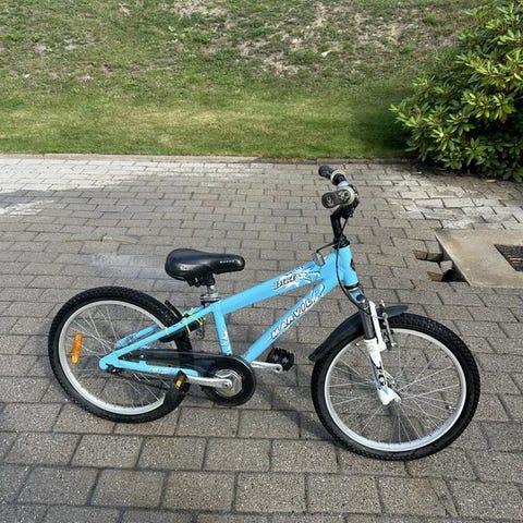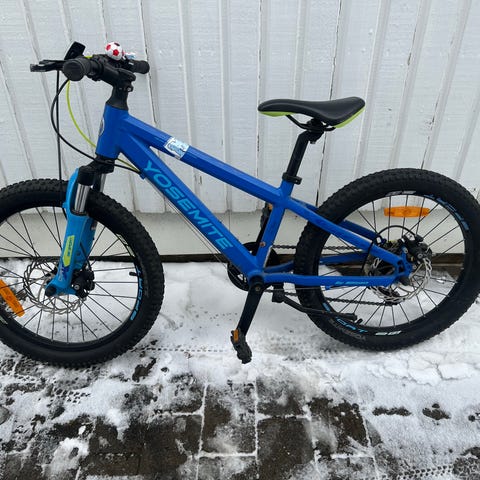Crescent barncykel med 20" hjul. Cykeln har blå ram med gröna detaljer och är utrustad med växlar som manövreras via vridreglage på styret. Modellen har fotbroms bak och handbroms fram. Passar som vardagscykel för barn som vuxit ur mindre hjulstorlek.