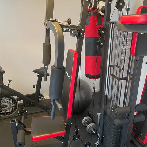 Multigym träningsstation i svart och röd färg. Utrustningen har vadderat säte och ryggstöd samt flera träningsstationer för överkropp, bland annat dragövningar, bröstpress och benövningar via viktmagasin. Avsedd för inomhusbruk i hemmet eller i mindre träningsutrymmen.