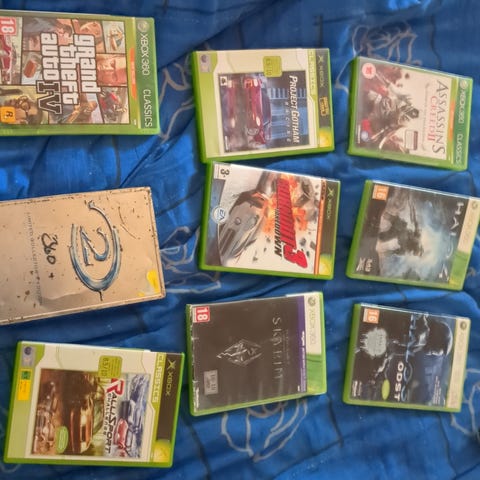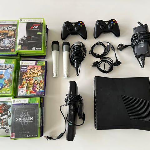 Microsoft Xbox 360 spelkonsol med två trådlösa handkontroller, Kinect-sensor och flera spel. Konsolen är av den svarta modellen och ansluts via HDMI och USB. Kinect-sensorn möjliggör rörelsestyrda spel. I paketet ingår ett urval Xbox 360-spel i originalfodral, bland annat action-, sport-, bil- och familjespel. Lämplig för användning med TV eller bildskärm som har HDMI-ingång. Strömkabel och nödvändiga anslutningar ingår.
