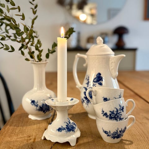 Porslin kaffekoppset med fat och tillhörande gräddkanna och sockerskål i blommönstrat flerfärgat utförande. Setet består av kaffekopp med tillhörande fat samt en mindre kanna och en burk med lock för exempelvis socker. Dekoren är blommig med inslag av blå och röda detaljer på vit botten, och ett av seten har guldfärgad kant. Passar för servering av kaffe eller te vid dukning.