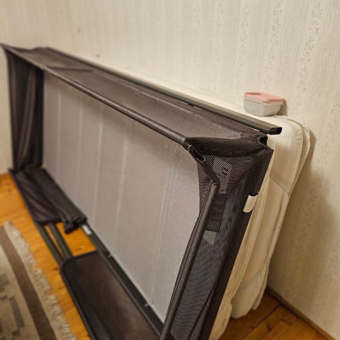 140x200 Himmelssäng, bra för barn /tweeny. Finns fläckfri guld bäddmadrass från Jysk och madrass från Jysk. Detta är ombyggd från en Jysk våningssäng som är nu bara den nedre delen. Spetsgardiner från Ikea på 3 av 4 sidor. Sidan mot väggen finns synliga skarv från ombyggnation. Går att ta bort överdelen för transport.