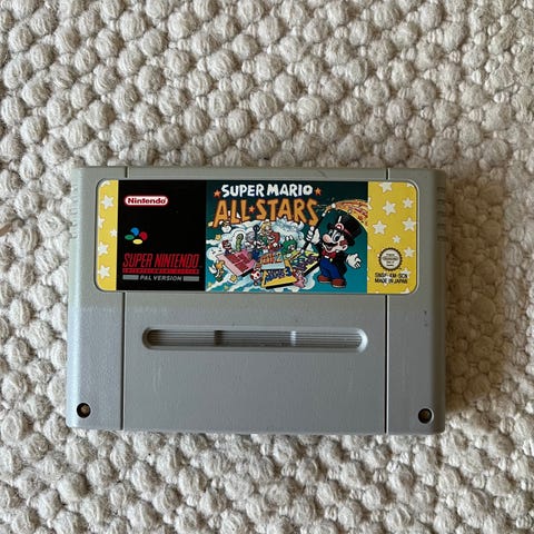 Super Mario All stars spel, hämtas med fördel upp i centrala Malmö.