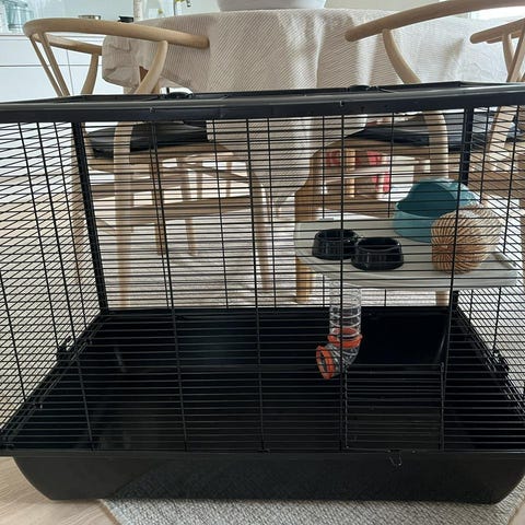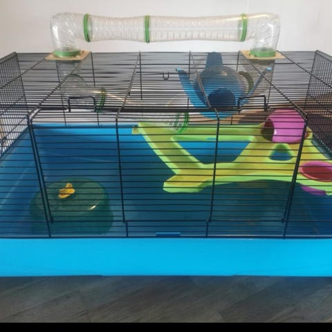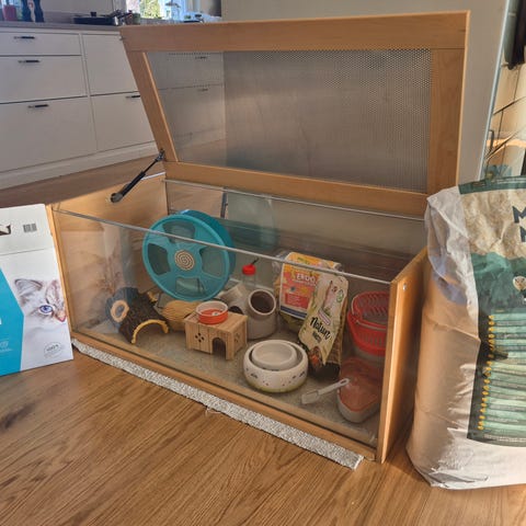 Hamsterbur med många möjligheter och tillbehör, i glas och trä. Ingår stort hjul, många böjbara broar, aktivitet leksaker, inredning, skålar, vattenflaskor, hus, hamster mat.