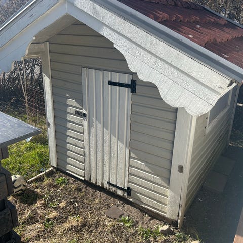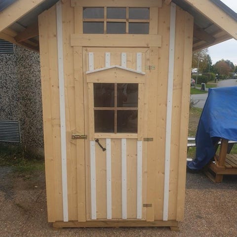 Fristående utedass i trä,grund målat i vitt med mörkare hörn- och dörrfoder. Byggnaden har enkeldörr med beslag och snedsträva samt pulpettak. Invändigt finns en fast träbänk med toalettlock. Passar som torrtoalett på tomt, fritidshus eller liknande plats där man behöver en enkel toalettlösning utan vattenanslutning. Ca 100x100 cm ,plast tak för bra ljus inne ,tag med släp och kom och titta 070 242 00 53 Hans