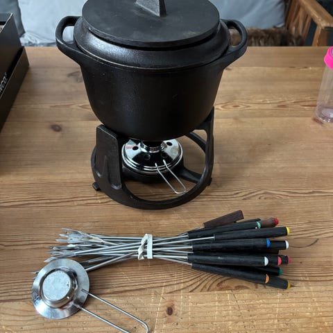 Oanvänd fonduegryta med tillbehör säljes. Från Ronneby Bruk - design Sigurd Persson.