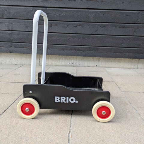 BRIO gåvagn i svart med vit metallbygel och hjul med röd och vit detalj. Klassisk modell som stöd för barn som lär sig gå. Passar för inomhusbruk och har lastutrymme för leksaker framtill. Tillverkad i trä med stabil konstruktion.