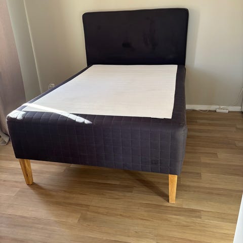 Sängram för enkelsäng 90x200cm i mörkgrå textilklädsel. Sängramen har både huvudgavel och fotgavel med knappliknande dekordetaljer samt ben i trä. Passar standard 90cm bred resårbotten. Lämplig för sovrum eller gästrum där en fristående sängram önskas.