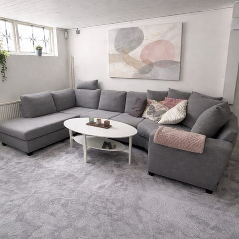 Ljusgrå 4-sitssoffa med schäslong (vänster)