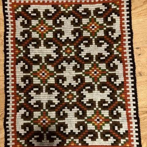Färgglad väggbonad i korsstygn med beslag i svart metall.