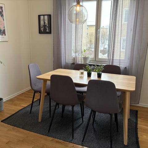 Bordet är i använt skick, märken och färg från pennor förekommer på bordsskivan. Se bilder.