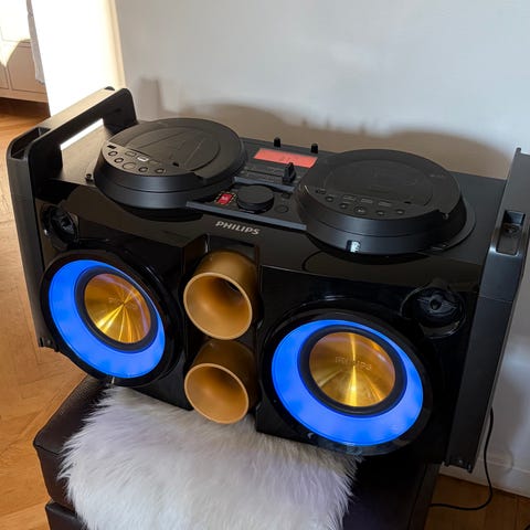 En Philips Boombox där man kan ha två musikkällor inkopplade (sladd/bluetooth/usb) och köra crossfadern mellan dem.