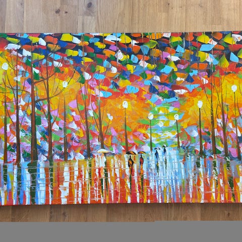 Säljer två färgstarka originalmålningar i olja på canvas med intensiva färger i gult, orange, blått, grönt och rosa. En riktig blickfångare som passar i vardagsrum, kontor eller hall.
