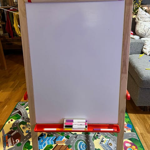 Magnetisk whiteboard och krittavla på andra sidan. Man kan också hänga en rulle för att rita och måla på papper.