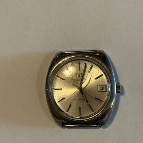 Armbandsur 35 mm, rostfritt stål. Silverfärgad urtavla med index. Mekaniskt urverk (manuell uppdragning). Troligen tillverkad Schweiz, 1960-talet. Matchande milanesiskt nätarmband