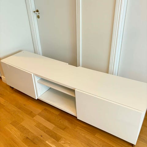 Vit tv-bänk med förvaring. Bänken har en låg, avlång form med två skåp på sidorna och tre lådor i mitten. Passar som tv-möbel eller förvaringsmöbel i vardagsrum eller sovrum. Slät ovansida ger plats för tv, mediautrustning eller dekoration. Neutralt utförande som fungerar i många typer av inredningar.