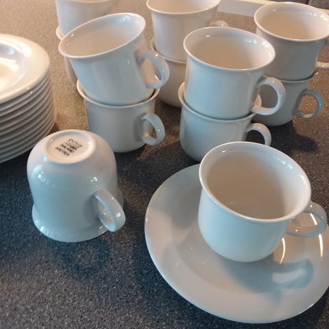 Ett dussin vackra och eleganta kaffekoppar med fat från serien Harlekin för Arabia.