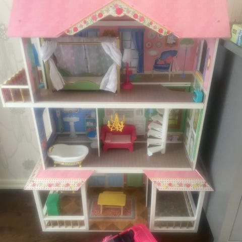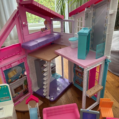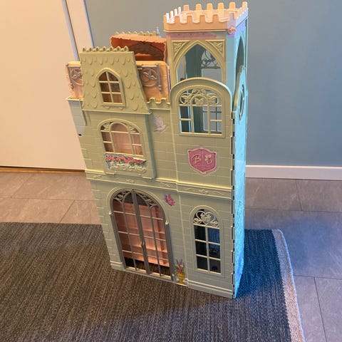 Barbie hus, bil, skola, lekplats samt garderob och olika tillbehör.