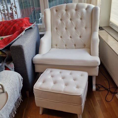 Tillhörande fotpall från IKEA i matchande beige ton. Inte exakt samma serie men passar mycket bra ihop.
