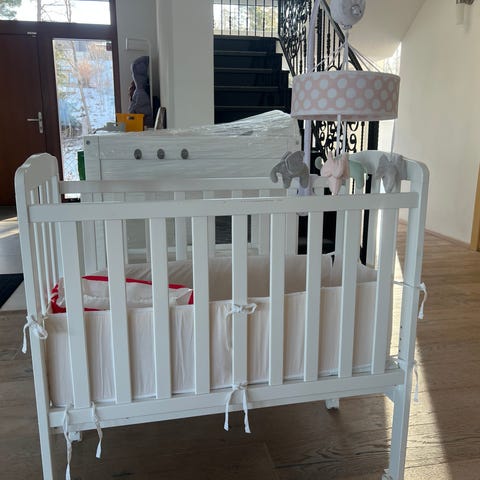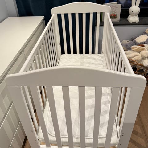NY Aldrig använd vit spjälsäng inklusive madrass
